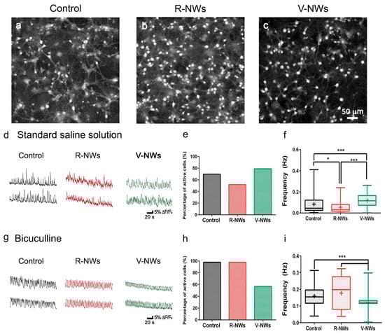 Hippocampal network activity by NWs orientation. Snapshots of representative fields of neuronal cultures grown on the control (a), R-NWs (b), and V-NWs (c) substrates cells are visualized by Oregon-Green 488 BAPTA-1 AM. Representative fluorescence tracings of repetitive Ca2+-transients in standard saline solution (d) or bicuculline-induced (g) recorded in hippocampal cultures of 8–10 DIV grown on the control (black), R-NWs (red), and V-NWs (green) (two sample neurons were selected from the same field). (e) The bar plot summarize the percentage of spontaneously active cells in a standard saline solution (control: n = 8 visual fields; R-NWs: n = 6; and V-NWs: n = 6; n = 3 series of cultures). (f) Box plot frequencies values for standard saline (control: n = 273 cells, 8 samples; R-NWs: n = 95 cells, 5 samples; and V-NW: n = 506 cells, 5 samples). (h) Percentage of spontaneously active cells in bicuculline (control: n = 7; R-NWs: n = 4; and V-NWs: n = 5). (i) Frequencies values in bicuculline (control: n = 430 cells, 7 samples; R-NWs: n = 119 cells, 5 samples; and V-NWs: n = 497 cells, 4 samples). p values: * p < 0.05, and *** p < 0.001.