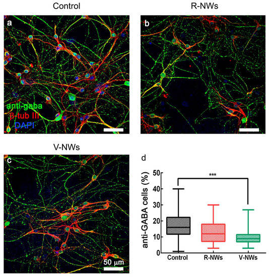 In summary, regardless of the diverse neuronal cell density, we did not detect differences in the number of active cells among the three substrates. Nevertheless, cells in the V-NWs were significantly more active when compared with the control and R-NWs in a standard medium. Still, the difference was reverted upon pharmacological removal of GABAA receptor-mediated activity. This prompted us to investigate and compare the number of GABAergic neurons among all conditions to inspect the network contribution of this cell phenotype. Neurons were co-immunostained with antibodies for β-tub III and anti-GABA (Figure 4). We identified GABAergic cells as double immunolabeled neurons. We detected a significant (*** p < 0.001, Kruskal–Wallis one-way ANOVA) reduction in their number in the V-NWs cultures ((9 ± 5)%, n = 29 visual fields from 3 different samples) compared with the control ((15 ± 9)%, n = 30 visual fields from 3 different samples; see the plot in Figure 4d). No significant differences were found when comparing control or V-NWs cultures with R-NWs ones ((12 ± 9)%, n = 28 visual fields from 3 different samples).