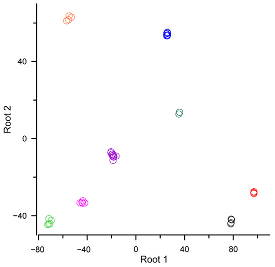Scatterplot of canonical scores for two discriminant functions, Root 1 and Root 2, after the multivariate discriminant analysis (MDA) of the fatty acid (FA) composition (% of total FAs, arcsine square root transformation). Division Bryophyta: black circles—order Dicranales, red circles—order Bryales, dark green circles—order Polytrichales, blue circles—order Hypnales *; division Marchantiophyta: light green circles—order Ptilidiales, pink circles—order Metzgeriales, purple circles—order Marchantiales, orange circles—order Jungermanniales. * Based on 10 samples from 8 species (including 7 single-replicate samples).