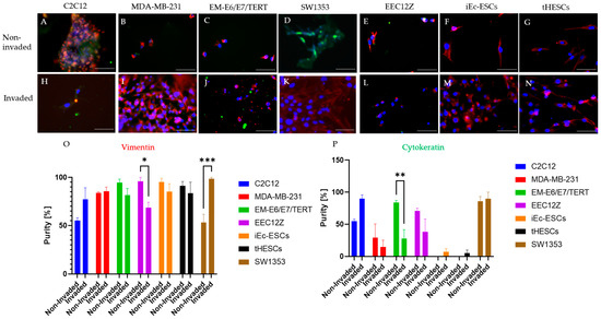Immunofluorescence staining of transwell invasion assay for vimentin (red) and cytokeratin (green) of mouse myoblasts C2C12, breast cancer cells MDA-MB-231, endometrial cancer cells EM-E6/E7/TERT, peritoneal endometriosis cells EEC12Z, ovarian endometriosis cells iEc-ESCs, and endometrium from endometriosis patients tHESCs. Fluorescent images are shown for non-invaded cells across the top and invaded cells along the bottom including (A) non-invaded C2C12, (B) non-invaded MDA-MB-231, (C) non-invaded EM-E6/E7/TERT, (D) invaded SW1353, (E) non-invaded EEC12Z, (F) invaded iEc-ESCs, (G) non-invaded tHESCs, (H) invaded C2C12, (I) invaded MDA-MB-231, (J) invaded EM-E6/E7/TERT, (K) invaded SW1353, (L) invaded EEC12, (M) invaded iEc-ESCs, (N) invaded tHESCs, (O) quantification of Vimentin expression and (P) quantification of Cytokeratin expression. Statistical significance is depicted by * p < 0.05, ** p < 0.01, *** p < 0.001 and is derived from a two-tailed unpaired t-test. Scale bars represent 100 μm.