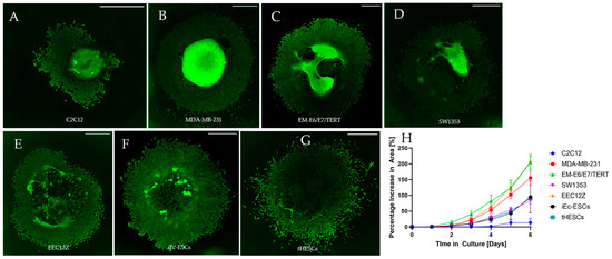 Immunofluorescence of spheroid drop assays stained for beta-actin (A) C2C12, and vimentin for (B) MDA-MB-231, (C) EM-E6/E7/TERT, (D) SW1353, (E) EEC12Z, (F) iEc-ESCs, and (G) tHESCs. The percentage increase in the area of spheroid drops for all cell lines over six days in culture is graphed and shown in (H). Scale bars represent 1 mm.