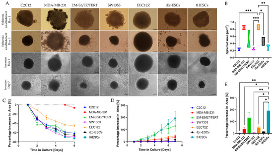 The percentage increase in spheroid area through the formation of invasive edges was determined on the final day of cell culture and compared. The cell line showing the highest invasiveness was EM-E6/E7/TERT and tHESCs (Figure 7E) after the addition of Geltrex (131.3% ± 44.1% and 191.0% ± 60.0%, respectively). SW1353 (6.3% ± 2.7%) and iEc-ESCs (16.3% ± 4.1%) behaved similarly to the negative control C2C12 (2.7% ± 2.7%), with MDA-MB-231 and EEC12Z’s invasive area sitting in between these two groups (39.0% ± 12.4% and 49.3% ± 8.4%, respectively). The only cell line that showed statistical significance in the increase in area was tHESCs, which had a statistically larger increase in invaded area than all cell lines except EM-E6/E7/TERT. EM-E6/E7/TERT and tHESCs also showed the fastest increase in area invaded (shown in Figure 7D), which would be expected from the final invasion area value.