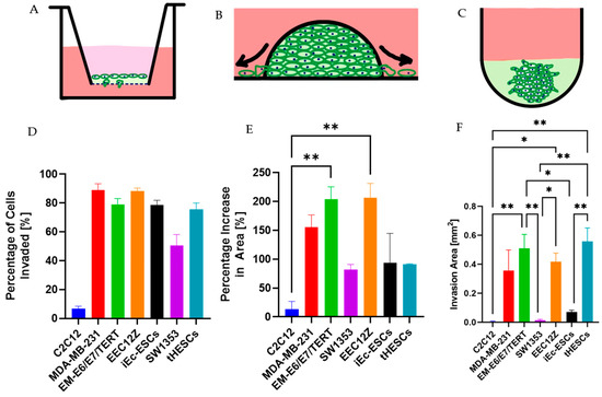 Cancer and endometriosis invasion comparison summary for the (A) transwell assay, (B) spheroid drop assay, and (C) spheroid gel invasion assay for C2C12, MDA-MB-231, EM-E6/E7/TERT, SW1353, EEC12Z, iEc-ESCs, and tHESCs. (D) Percentage of cells invaded through the transwell after 48 h of culture (significance table found in Figure 1B). (E) Percentage change in area on day six of culture for the spheroid drop assay. (F) Percentage change in area on day seven for the spheroid gel invasion assay. Error bars represent the standard error of the mean. * p < 0.05, ** p < 0.01, are derived from a one-way ANOVA analysis and Bonferroni post hoc test.
