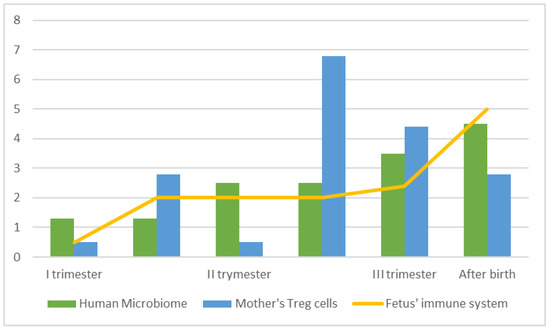 Several prospective advantages are associated with a placental microbiome and the mechanisms that occur at this interface [23]. The bacteria can be transported via the placenta and have a role in early immune development; however, the efficiency or benefit of this transfer is dependent on certain microorganisms that may be associated with newborn or early childhood immunological disorders [24]. If maternal antigens help in the transmission of microorganisms and then boost the establishment of early immune cell populations, the decreased maternal immunity may impact the infant’s immunological development (see Figure 1). The illustrative figure approximates probable fluctuations in maternal Treg cells and the presence of the placental microbiome that contribute to the adaptation and maturation of the fetal immune system, which continues after birth [25,26]. In line with this thesis, in prenatal trials with mice, antibiotics induced dysbiosis, impaired early immunological development, and increased susceptibility to viral infections [27].