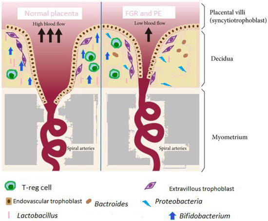 Placental disorders include pregnancy loss, fetal growth restriction, preeclampsia, preterm delivery, premature rupture of membranes, placental abruption, and intrauterine fetal death [52]. The two-stage process of implantation and placental development involves maternal–fetal interaction and adaptation [53,54]. The changes in the syncytiotrophoblast, trophoblast, and uterine arteries are under the influence of uterine natural killer cells and regulatory T cells [55,56]. Angiogenic factors, such as the PlGF (placental growth factor) and sFLT (soluble fms-like tyrosine kinase-1) regulate placental angioneogenesis, vasculogenesis, and maternal circulatory adaption [57]. Maternal immunotolerance, uterine natural killer, or regulatory T-cell dysregulation in placental disorders can cause syncytiotrophoblast and trophoblast ischemia, hypoxia, and angiogenic factor imbalance. A placental syndrome develops on the basis of impairment onset, intensity, and association with other dysfunctions, e.g., dysbiosis. Our research is focused on alterations in the diversity and structure of the microbiome in preeclampsia and FGR, as important problems in obstetrics, affecting 5–10% of pregnancies worldwide [58,59]. However, the incidence of FGR in women with severe preeclampsia can exceed 22% [60].