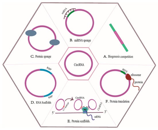 CircRNAs mechanisms of action. (A) The interplay between backsplicing and canonical splicing for the same splice site selection that can ultimately affect pre-mRNA splicing. (B) CircRNAs as ceRNAs that modulate the bioavailability of miRNAs. (C) CircRNAs can function as decoys or sponges for proteins that bind to proteins. (D) CircRNAs as RNA scaffolds. (E) Circular RNAs as protein scaffolds. (F) CircRNAs regulate protein translation.