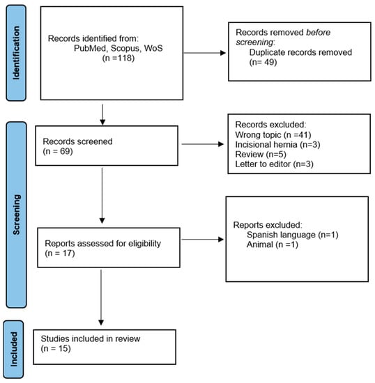 A total of 118 studies were found in the literature. Duplicate studies or those that did not meet eligibility criteria, such as review articles or studies that included incisional or recurrent hernias, were excluded (n = 101). The full texts of 17 studies were evaluated and two of them were excluded because they were written in Spanish and included lab rats in the study. We selected 15 studies, and data regarding IH were extracted from all included studies (Figure 1).