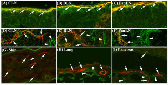 Skin, lungs, and pancreas, and their draining LNs (cervical LN (CLN), bronchial LN (BLN), and pancreatic LN (PanLN), respectively) were harvested from 6-wk-old female WT mice, frozen, and sectioned. Acetone-fixed sections were incubated with Abs against LYVE-1 and ICAM-1 or with negative control Abs for 1 h and washed in phosphate-buffered saline (PBS). The sections were then incubated with Alexa Fluor 546-donkey anti-goat IgG Ab (to detect LYVE-1) and Alexa Fluor 488-donkey anti-rat IgG Ab (to detect ICAM-1) in PBS with 4% normal mouse serum for 45 min. After three washes with PBS, the sections were mounted, cover-slipped, and imaged on an Olympus fluorescence microscope (BX60, Olympus America Inc., Center Valley, PA, USA) equipped with a QImaging digital camera (Retiga 2000R, Surrey, British Columbia, Canada) using Image-Pro Plus software (Version 6.2.0.424, Media Cybernetics Inc., Bethesda, MD, USA).