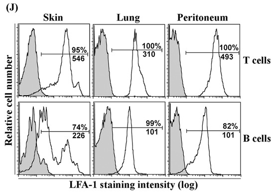 To evaluate the expression of LFA-1 on peripheral tissue lymphocytes, we isolated lymphocytes from the skin, lungs, and peritoneum of naive C57BL/6 mice and performed immunofluorescence staining and flow cytometric analysis (Figure 1J). LFA-1 was expressed on >95% of T cells from each tissue, with the highest expression on skin T cells, and on >70% of B cells, with a bimodal expression pattern on skin B cells. In each tissue, T cells expressed higher levels of LFA-1 than B cells.
