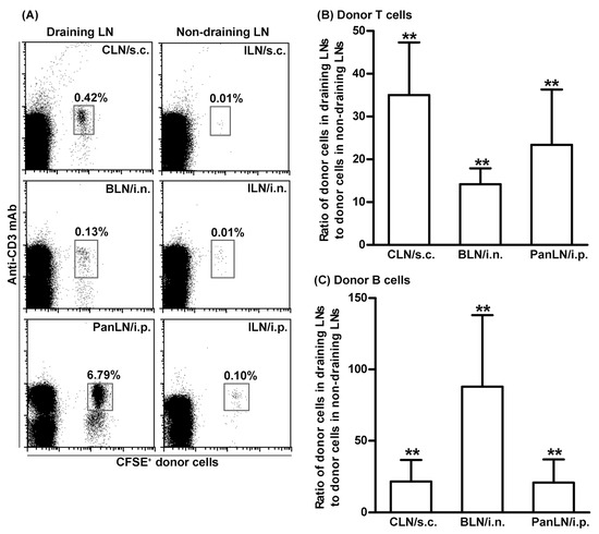 Lymphocytes migrate efficiently from peripheral tissues into draining lymph nodes. Fifty million carboxyfluorescein succinimidyl ester (CFSE)-labeled lymphocytes from young wild-type (WT) mice were transferred subcutaneously (s.c.), intranasally (i.n.), or intraperitoneally (i.p.) into young WT host mice. Sixteen hours after transferring into tissues, donor lymphocytes in the draining LNs ((cervical LNs (CLNs) for s.c., bronchial LNs (BLNs) for i.n., and pancreatic LNs (PanLNs) for i.p., and non-draining inguinal LNs (ILNs)) were identified by immunofluorescence staining with monoclonal antibodies against CD3 and B220 and evaluated by flow cytometric analysis. (A): representative flow cytometric plots show donor T cells (CFSE+CD3+ cells) as the percentage of total lymphocytes in organ-draining LNs (left column) and non-draining LNs (right column) of host mice. (B,C): Donor T (B) and B (C) cells migrated into draining LNs at least 15-times more than into non-draining LNs after transferring into tissues. Student’s t-test, ** p < 0.01 compared with the theoretical input ratio, which is set as 1. n = 7–8 mice in each group.