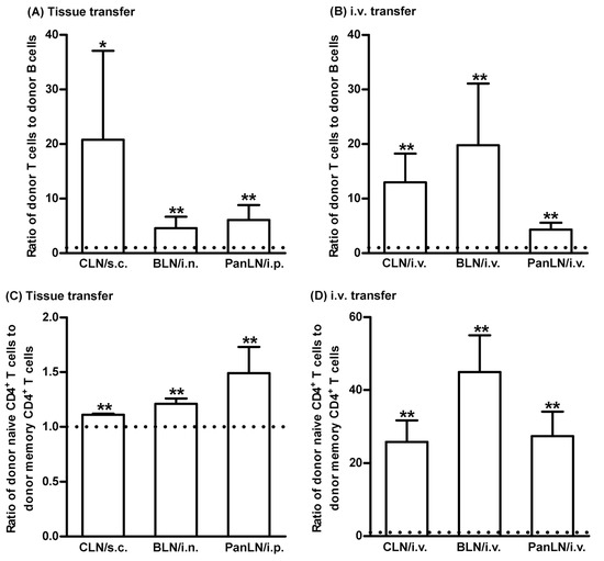 3.3. T Cells Migrate More Efficiently Than B Cells from Peripheral Tissues into Draining LNs