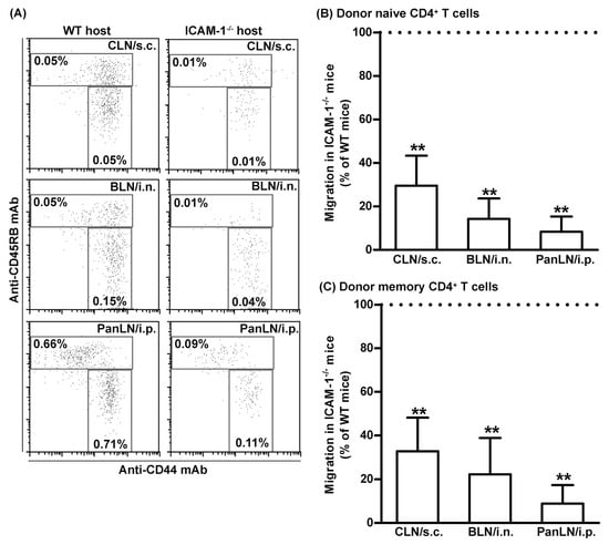 Intercellular adhesion molecule-1 (ICAM-1) deficiency in mice has an equal effect on the migration of naive CD4+ and memory CD4+ T cells from peripheral tissues into draining LNs. Fifty-million carboxyfluorescein succinimidyl ester-labeled lymphocytes from >1 year old wild-type (WT) mice were transferred into the tissues of WT and ICAM-1-deficient (ICAM-1-/-) mice. Sixteen hours after cell transfer, donor naive CD4+ T cells (A,B) and donor memory CD4+ T cells (A,C) in the cervical lymph nodes (CLNs), bronchial LNs (BLNs), and pancreatic LNs (PanLNs) of host mice were identified by immunofluorescence staining with monoclonal antibodies against CD4, CD44, and CD45RB, and evaluated by flow cytometric analysis. (A): Representative flow cytometric plots show the percentages of donor naive CD4+ (CD44low-highCD45RBhigh) and memory CD4+ (CD44highCD45RBlow) T cells in the total lymphocytes of organ-draining LNs of WT (left column) and ICAM-1-/- (right column) host mice after cell transfer into tissue. (B,C): Donor naive CD4+ (B) and memory CD4+ (C) T cells migrated less avidly from the peripheral tissue into draining LNs in ICAM-1-/- host mice than in WT host mice. The migration of donor naive CD4+ (B) and memory CD4+ (C) T cells into the LNs of ICAM-1-/- mice is expressed as the percentage of the migration into LNs of WT mice, which is set at 100%. Student’s t-test, ** p < 0.01 compared to WT mice, n = 4–5 mice in each group.