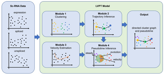 As shown in Figure 1, the input into the LVPT model includes the gene expression matrix for a given starting node, the spliced gene expression matrix, and the unspliced gene expression matrix from scRNA-seq data. The LVPT model consists of four modules, including clustering, velocity estimation, pseudotime inference, and trajectory inference. We developed a new method for the pseudotime inference module. In this module, we used cell velocity and the gene expression matrix to calculate pseudotime during cell growth and development, the Leiden algorithm to cluster the cells, scVelo for velocity estimation, and the PAGA method to obtain the connection relationship between clusters and combined this with pseudotime to determine the direction of trajectory connection.