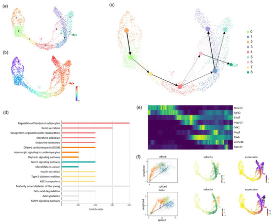 Application of LVPT to the pancreas dataset. (a) Scatter plot of the Leiden clustering result. (b) Scatter plot of pseudotimes inferred by LVPT. (c) Trajectory plot with clustering labels. The width of the edge indicates the weight between the clusters. (d) Histogram of enrichment analysis results. Different colors represent different categories. (e) Heatmap of differential genes. Genes are ordered by trajectory, and expression is ordered by pseudotime. (f) Spliced and unspliced expression plots, velocity plots, and mRNA expression plots of Abcc8 and Gnas.