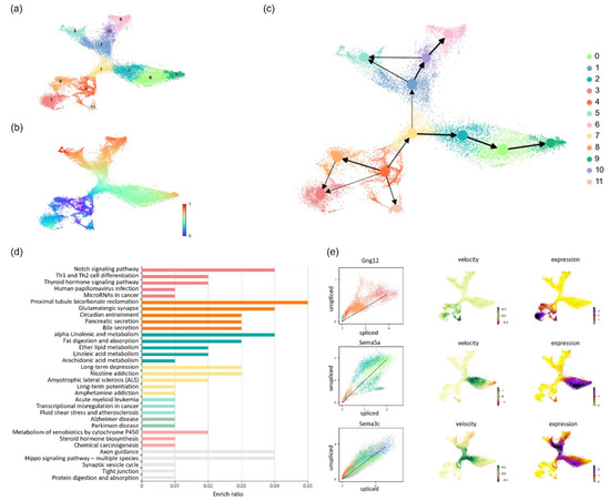 Application of LVPT to the hippocampus dataset. (a) Scatter plot of the clustering result. (b) Scatter plot of the pseudotime inferred by LVPT. (c) Trajectory result plot. The evolution of hippocampal cells starts from cluster 4 and moves toward 5 evolution directions. (d) Histogram of enrichment analysis results. Different colors represent different categories. (e) Spliced and unspliced gene expression plot, velocity plot, and mRNA expression plot of Gng12, Sema5a, and Sema3c.