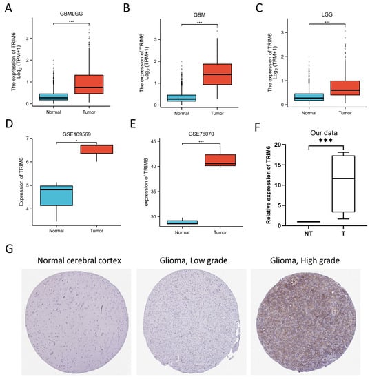 3.1.1. TRIM6 Is Highly Expressed in Gliomas