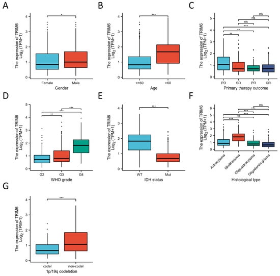 The correlation of the expression of TRIM6 and clinical features in Gliomas. Gender (A), Age (B), primary therapy outcome (C), WHO grade (D), IDH status (E), Histological type (F) and 1p/19q codeletion (G). Data are presented as mean ± SD. Statistical analysis was performed using t-test, and p < 0.05 was considered statistically significant (* p < 0.05, ** p < 0.01, *** p < 0.001). ns, non-significance. The interpretation of the box plot is consistent with Figure 1.