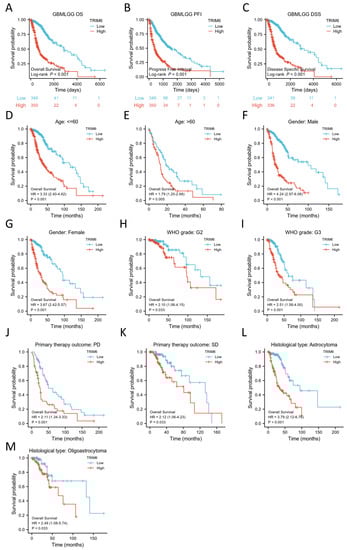 Kaplan–Meier survival curve analysis of the prognostic significance of a high and a low expression of TRIM6 in Gliomas using The Cancer Genome Atlas (TCGA) databases. (A–C) Kaplan–Meier estimates of the overall survival, disease specific survival and progress free interval probability of TCGA patients in all Gliomas patients. Subgroup analysis for age under 60 years (D), greater than 60 years (E), Male (F), Female (G), WHO grade G2 (H), WHO grade G3 (I), progression disease/stable disease (PD/SD) (J,K), Astrocytoma/Oligoastrocytoma (L,M).