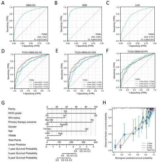 According to the TCGA database, TRIM6 expression can be considered a discriminatory factor based on the ROC analysis, with an area under the curve (AUC) of 0.821, indicating its potential as a diagnostic biomarker for Gliomas relative to normal tissue (Figure 4A). The AUC for TRIM6 expression in Glioblastoma (GBM) and Lower Grade Glioma (LGG) is 0.961 and 0.791, respectively (Figure 4B–C). Furthermore, ROC curve and nomogram analyses were conducted on TRIM6 gene expression data from the TCGA database to evaluate its prognostic value. The AUCs for 1-year, 3-year, and 5-year OS were 0.776, 0.817, and 0.746, respectively (Figure 4D). The AUCs for 1-year, 3-year, and 5-year DSS were 0.783, 0.817, and 0.754, respectively (Figure 4E). The AUCs for 1-year, 3-year, and 5-year PFI were 0.759, 0.734, and 0.774, respectively (Figure 4F). These findings indicate that high TRIM6 expression is a significant poor prognostic indicator for Glioma patients. Cox regression analyses were performed to identify independent predictors of OS in Gliomas. In the univariate model, WHO grade, IDH status, 1p/19q codeletion, primary therapy outcome, age, histological type, and TRIM6 expression were all significantly associated with OS in Gliomas (Table 2, all p < 0.05). In the multivariate analyses, TRIM6, as well as WHO grade, IDH status, primary therapy outcome, gender, and age, remained significantly associated with OS in Gliomas (HR = 1.591, 95% CI = 1.027–2.466, p = 0.038). The DSS analysis yielded similar results (Table S1, HR = 1.716, 95% CI = 1.080–2.726, p = 0.022). However, the multivariate regression analysis did not show a significant association between TRIM6 and PFS in Glioma patients (Table S2, HR = 1.090, 95% CI = 0.766–1.551, p = 0.633). These findings suggest that TRIM6 expression is an independent predictive factor for Glioma patients’ OS and DSS. A nomogram was constructed using the expression level of TRIM6 and clinical factors confirmed by multivariate studies to predict the survival probability of patients at 1, 3, and 5 years (Figure 4G). The calibration plot demonstrated good agreement between the prediction and the observation, as the bias-corrected line closely approximated the ideal 45-degree line (Figure 4H).
