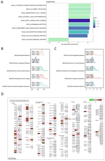 Single gene difference analysis between high expression TRIM6 group and low expression TRIM6 group using data from TCGA glioma database. (A) Enrichment plots from gene set enrichment analysis (GSEA). (B–C) mountain map of top 10 KEGG Gene sets. (D) Pathview map of Cytokine-cytokine receptor interaction (map040600).