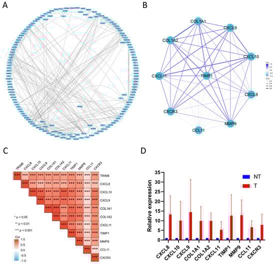 Data on protein interactions are represented by complex network diagrams in the STRING database, where nodes correspond to proteins and edges represent interactions between proteins. We constructed the PPI network diagram of DEGs using the STRING database (Figure 7A). Utilizing Cytoscape’s plug-in cytoHubba with the Degree algorithm, we identified the top 10 hub genes, namely COL1A1, COL1A2, CXCL8, CXCL9, CXCL10, CXCL11, CCL11, CXCR3, MMP9, and TIMP1, which exhibited the strongest associations with other nodes in the PPI network (Figure 7B). Gene co-expression correlation analysis demonstrated a strong positive correlation between these hub genes and TRIM6, as well as among themselves (Figure 7C). Subsequently, we collected tumor specimens from four patients with high-grade gliomas, along with their corresponding adjacent non-tumor tissues, at our institution. Using qPCR analysis, we evaluated the mRNA expression levels of the ten hub genes and TRIM6 in the tumor tissues relative to the adjacent non-tumor tissues. The results showed a significant upregulation of COL1A1, COL1A2, CXCL8, CXCL9, CXCL10, CXCL11, CCL11, CXCR3, MMP9, and TIMP1 mRNA expression levels in the glioma tumor tissues compared to the adjacent non-tumor tissues (Figure 7D).