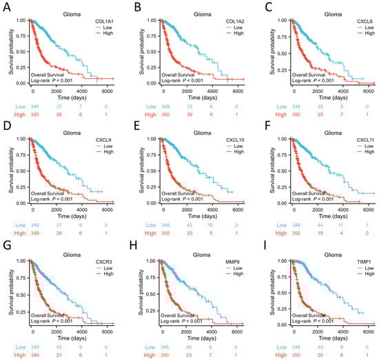 Prognostic analysis of 9 hub genes using data from TCGA glioma database. COL1A1 (A), COL1A2 (B), CXCL8 (C), CXCL9 (D), CXCL10 (E), CXCL11 (F), CXCR3 (G), MMP9 (H), TIMP1 (I).