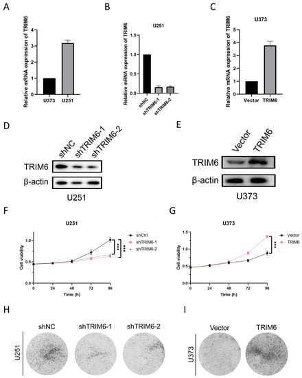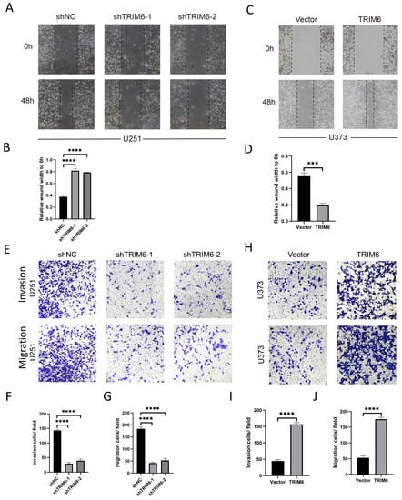 We initially assessed the expression levels of TRIM6 in two glioma cell lines, U251 and U373, using qPCR analysis (Figure 9A). Remarkably, U251 cells exhibited higher TRIM6 mRNA transcript levels compared to U373 cells. To further investigate the functional role of TRIM6, we employed two different shRNAs to knockdown TRIM6 in U251 cells, while U373 cells were transfected with a TRIM6 overexpression plasmid. The transcriptional levels of TRIM6 were validated using qPCR, while TRIM6 protein expression levels were assessed by Western blotting. Notably, both shTRIM6-1 and shTRIM6-2 successfully led to a significant reduction in TRIM6 mRNA transcript levels (Figure 9B) and a corresponding decrease in protein expression levels (Figure 9D) compared to the shNC control group in U251 cells. Conversely, in U373 cells, the overexpression of TRIM6 following plasmid transfection resulted in a substantial upregulation of TRIM6 mRNA transcript levels (Figure 9C) and a significant increase in protein expression levels (Figure 9E) compared to the Vector control group. Subsequent CCK8 assays demonstrated a significant decrease in cell viability in both shTRIM6-1 and shTRIM6-2 groups of U251 cells after 96 h of TRIM6 knockdown, compared to the shCtrl control group (Figure 9F, p < 0.001). In contrast, the overexpression of TRIM6 in U373 cells led to a significant increase in cell viability compared to the Vector control group (Figure 9G, p < 0.001). Furthermore, we conducted colony formation assays. The results revealed a remarkable reduction in colony formation in the shTRIM6-1 and shTRIM6-2 groups of U251 cells compared to the shNC group (Figure 9H). Conversely, the overexpression of TRIM6 in U373 cells significantly enhanced colony formation compared to the Vector control group (Figure 9I). The cell wound healing assay and Transwell assay were performed to assess the impact of TRIM6 on the invasive and migratory abilities of glioma cells. The results are as follows: In the U251 cell line, both the shTRIM6-1 and shTRIM6-2 groups exhibited significantly wider scratch gaps compared to the control group (shNC) after 48 h, indicating decreased cell migration (Figure 10A,B). In the Transwell assay, the shTRIM6-1 and shTRIM6-2 groups showed a significant decrease in the invasion and migration abilities compared to the control group (shNC), indicating reduced cell invasion and migration (Figure 10E–G, p < 0.001). In the U373 cell line, the overexpression of TRIM6 resulted in a significant reduction in scratch gap width compared to the Vector control group after 48 h, indicating enhanced cell migration (Figure 10C,D). The overexpression of TRIM6 also resulted in a significant increase in the invasion and migration abilities compared to the Vector control group, indicating enhanced cell invasion and migration (Figure 10H–J, p < 0.001).