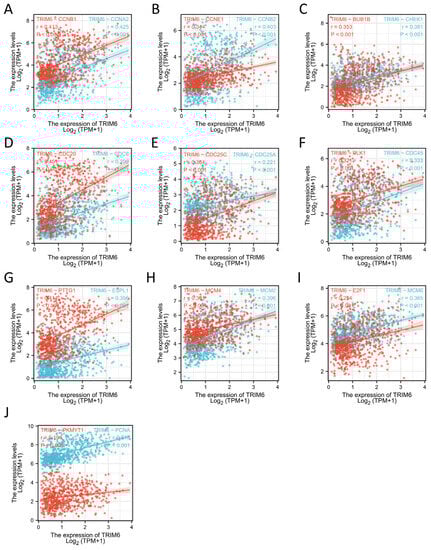 Correlation analysis between TRIM6 and the cell cycle regulatory genes in Gliomas in The Cancer Genome Atlas (TCGA). (A) CCNA2, CCNB1, (B) CCNB2, CCNE1, (C) CHEK1, BUB1B, (D) CDC6, CDC20 (E) CDC25A, CDC25C, (F) CDC45, PLK1, (G) EXPL1, PTTG1, (H) MCN2, MCM4, (I) MCM6, E2F1, (J) PCNA, PKMYT1. r, Pearson correlation coefficient.
