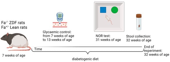 Starting from arrival, both lean controls and ZDF animals were fed with a diabetogenic diet (Purina 5008; Charles Rivers Laboratories, Lecco, Italy) until the end of the experiments, at 32 weeks of age. The glycemic condition was evaluated weekly starting from the arrival of the animals until 13 weeks of age by tail vein blood glucose measurement using a commercial glucometer (Contour next, Ascensia Diabetes Care Italy, Milan, Italy). At 11 weeks of age, all ZDF rats presented feeding blood glucose above 300 mg/dL. Body weight and animal well-being were assessed weekly and twice a week, respectively, throughout all the experiment. Memory function was evaluated at 31 weeks of age. At 32 weeks of age, all rats were euthanized under deep isoflurane anesthesia and the hippocampus and plasma were collected and stored at −80 °C until analyzed (Figure 1). Stool samples were collected 24 h before the sacrifice. Blood samples were collected in tubes with EDTA 0.25 M, and plasma was obtained by centrifugation at 2500× g for 15 min at 4 °C [37].