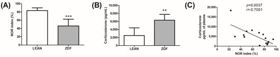 Memory deficit of diabetic animals detected with the novel object recognition (NOR) test and corticosterone plasma levels. (A): NOR index; (B): corticosterone plasma levels; and (C): correlation analysis between NOR index and corticosterone levels. Analysis was performed in non-diabetic controls (lean) and Zucker diabetic fatty rats (ZDF) at 8 months of age. The columns represent the mean ± SD (n = 8–6). Normal distribution of data was evaluated with Kolmogorov–Smirnov test; then, two-tailed Student’s t-test analysis was applied. If the F test for variance was significant, an unpaired t-test with Welch’s correction was used: ** p < 0.01 and *** p < 0.001 vs. lean.