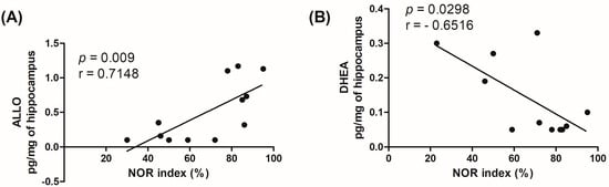 Correlation analysis. The levels of allopregnanolone (ALLO—(A)) and dehydroepiandrosterone (DHEA—(B)) in the hippocampus are in correlation with the NOR index. The p-value (p) and Pearson’s r (r) are reported.