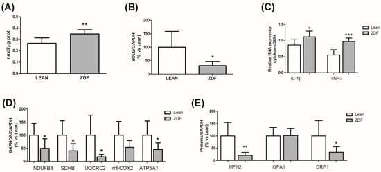 Alterations in the hippocampus. Thiobarbituric acid reactive substances (TBARS) (A), protein expression levels of superoxide dismutase 2 (SOD2) (B), gene expression levels of the pro-inflammatory cytokines interleukin 1 beta (IL−1β) and tumor necrosis factor-alpha (TNFα) (C), protein expression levels of the mitochondrial oxidative phosphorylation system (OXPHOS) and, in particular, of the proteins NDUFA8B, SDHB, UQCRC2, mt-COX2, and ATP5A1 (D) and of proteins involved in mitochondrial dynamics, such as mitofusin−2 (MFN2), mitochondrial dynamin-like GTPase (OPA1), and dynamin-related protein (DRP1), (E) were analyzed in the hippocampus of non-diabetic controls (lean) or of Zucker diabetic fatty rats (ZDF) at 8 months of age. The columns represent the mean ± SD (n = 8–6). Normal distribution of data was evaluated with Kolmogorov–Smirnov test; then, two-tailed Student’s t-test analysis was applied. If the F test for variance was significant, an unpaired t-test with Welch’s correction was used: * p < 0.05, ** p < 0.01, and *** p < 0.001 vs. lean.