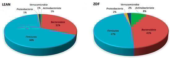 The composition of gut microbiota was characterized using 16S rRNA next-generation sequencing analysis. To explore changes in the intestinal microbiota due to T2DM, we first analyzed α- and β-diversity in stools collected 24 h before sacrifice. We observed a statistically significant decrease in α-diversity in ZDF, as assessed by the Shannon index (Benjamini–Hochberg-adjusted p-value = 0.037), Faith’s phylogenetic distance (Benjamini–Hochberg-adjusted p-value = 0.008) and observed OTUs (Benjamini–Hochberg-adjusted p-value = 0.003). The evenness index showed a similar trend but failed to reach statistical significance (Benjamini–Hochberg-adjusted p-value = 0.132). In addition, β-diversity analysis revealed statistically significant differences based on both unweighted (Benjamini–Hochberg-adjusted p-value = 0.001) and weighted (Benjamini–Hochberg-adjusted p-value = 0.001) UniFrac distance, as well as Bray–Curtis dissimilarity (Benjamini–Hochberg-adjusted p-value = 0.001). In the predominant phyla observed in stool samples (i.e., Firmicutes lean: 66.30 ± 8.07; ZDF: 47.20 ± 3.78 and Bacteroidota lean: 31.19 ± 8.35; ZDF: 40.52 ± 3.69), no significant differences were observed in the two groups (Figure 4). However, as suggested by the pie chart, bacterial taxa belonging to Actinobacteriota and Proteobacteria were significantly increased in ZDF animals (Figure 5 and Figure 6A).