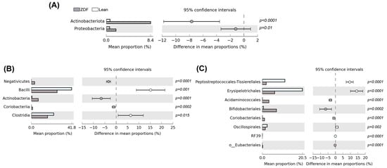 Mean proportions and differences in mean proportion are shown for significantly different bacterial species for phylum (A), class (B), and order (C) taxonomy ranks in lean and ZDF rats. The black bars highlight the 95% confidence intervals of each analysis.