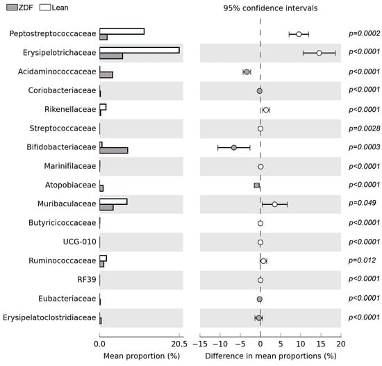 Mean proportions and differences in mean proportion are shown for significantly different bacterial species for family taxonomy ranks in lean and ZDF rats. The black bars highlight the 95% confidence intervals of each analysis.