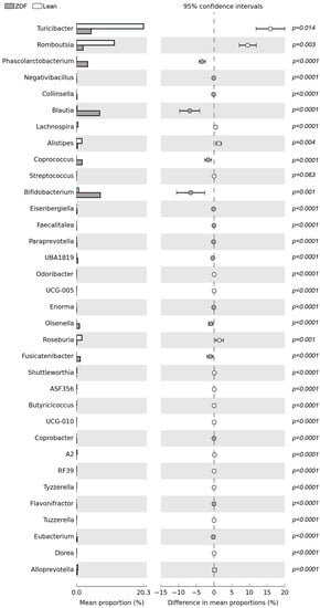 Mean proportions and differences in mean proportion are shown for significantly different bacterial species for genus taxonomy ranks in lean and ZDF rats. The black bars highlight the 95% confidence intervals of each analysis.
