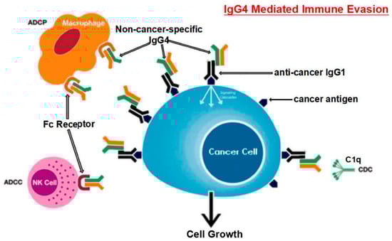 Schematic representation of the hypothesized mechanism for immune evasion by cancer cells using B lymphocyte-produced IgG4. Long-term contact with tumor antigens induces B cells to switch classes and produce IgG4. Due to its unique structural and biological characteristics, increased IgG4 in the cancer microenvironment creates an effective immune evasion mechanism for the disease. The terms antibody-dependent cell-mediated cytotoxicity (ADCC), antibody-dependent cell phagocytosis (ADCP), complement-dependent cytotoxicity (CDC), and natural killer cells (NK) are abbreviations of these processes. Adapted from []. This article is open access and is distributed under the Creative Commons Attribution Non-Commercial (CC BY-NC 4.0) license, which enables others to distribute, remix, adapt, and build upon it for non-commercial purposes and to license their derivative works under different conditions as long as the original work is properly cited, due credit, any changes are noted, and the use is for non-commercial purposes.