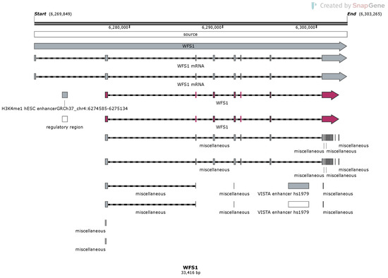 Wolfram Syndrome (WFS) is a rare, autosomal, recessive neurogenetic disorder that affects different organs and functions. The syndrome is characterised by diabetes insipidus, diabetes mellites, optic atrophy, and deafness, hence the acronym DIDMOAD [1,2,3]. It is inherited as an autosomal recessive disease caused by homozygous or compound heterozygous mutation in the WFS1 gene that encodes the wolframin ER transmembrane glycoprotein [4,5,6]. Wolfram syndrome 2 is caused by the homozygous mutations in the CISD2 gene and is also inherited as an autosomal recessive disorder [7]. The WFS1 gene is located in chromosome 4, locus 4p16.1 and CISD2 is in 4q24 [4,5,7,8]. WFS can be diagnosed as juvenile diabetes mellitus and diabetes insipidus, combined with deteriorating vision and hearing in a child with no developmental abnormalities and perfectly normal health until the onset [3,9,10]. Additional abnormalities start to develop, like urinary tract and bladder atonia, renal functional changes, and cataracts. The disease also affects the brain and central nervous system, and many neurological functions are affected, indicating a string impact in the neurodegeneration [3,11,12]. The syndrome can be very variable, but the presence of the DIDMOAD complex is central for the diagnosis of WFS1 [3]. In addition, the central neurodegenerative changes, neuromuscular pathology with biochemical alterations in muscles, have been described [13,14]. The complexity of clinical traits indicates that while the inheritance can be quite simple and clear, the penetrance and expression of the features is complex. On the other hand, we need to consider the complexity of the function of these proteins, WFS1 and CISD2. Lack of the function of reduced activity of the protein will impact specific functions in different cell types, leading to the complex clinical phenotype. Therefore, single mutation on a single gene can lead to a complex and diverse clinical presentation, depending on the affected cells, their resilience, and their functional capacity. Describing and understanding the mechanisms of this complexity forms the principal foundation of genomic medicine and genomic pathology. In the present review, we focus only on the WFS1 gene and will give an overview of the recent genomic data for the WFS1 gene.