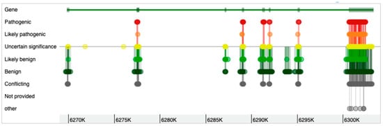 The WFS1 gene has eight exons (Figure 1), with the eighth exon as the largest, and the gene can form 15 different transcripts (Table 1). Most of the mutations in the WFS1 gene are at exon 8 [33,36]. As shown in Figure 2, while the genomic variants are spread all over the WFS1 gene, the variants with pathogenic, likely pathogenic, and uncertain significance are mostly accumulated in exon 8. Only a few pathogenic/likely pathogenic variants are in the other parts of the gene. Interestingly, for the full-spectrum Wolfram syndrome, both alleles must be affected by the mutations. In the case of only single-allele mutation, significantly increased risk for type 2 diabetes, hearing loss, depression, suicide, and other complex diseases have been described. While the list of these diseases is long, the phenotypic complexity of WFS1 helps to explain most of these traits affected by the variations in the WFS1 gene. The most described findings with the heterozygosity of the WFS1 gene are related to the hearing loss and psychiatric diseases. One of the most remarkable effects is related to the psychiatric illnesses. It has been identified that out of 11 relatives of WFS1 patients who were hospitalised, 10 were heterozygous carriers of WFS1 mutations [17]. This indicated a 26-fold increased risk for the psychiatric hospitalisation of WFS1 carriers versus non-carriers. Psychiatric findings are very common in WFS1 patients and relatives, indicating the significance of the WFS1 gene as a potential target for psychiatric illnesses. On the other hand, the effect of WFS1 mutations on growth has not been described as a common feature of the disease. This is peculiar, as the pituitary atrophy in WFS1 patients was described a long time ago [37]. Moreover, the short stature and growth hormone deficiency has also been reported in early studies on WFS1 patients [38]. Mouse studies also identified the growth retardation after the deletion of the WFS1 gene [39].