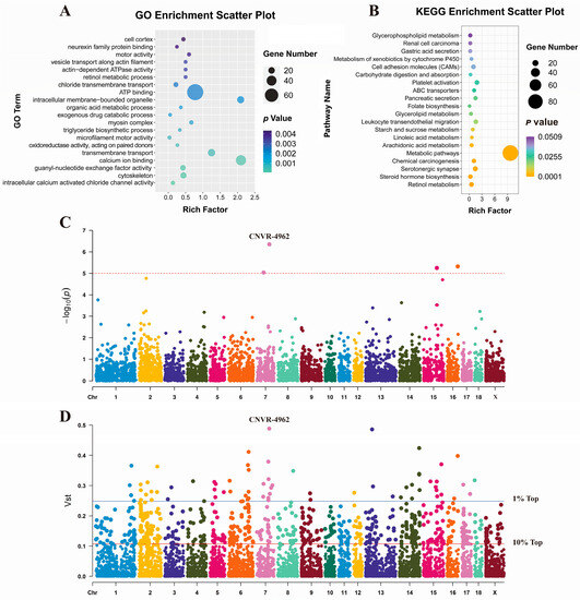 Subsequently, genes overlapping with CNVRs (Sscrofa 11.1) were investigated to elucidate their potential functional implications. A total of 2357 genes were found to be overlapped by the 6869 CNVRs, comprising 1188 known genes and 1169 novel genes (Table S6). To gain insights into the functional characteristics of these genes, GO and KEGG enrichment analyses were performed using the KOBAS tool. The enriched GO terms included “ATP binding”, “calcium ion binding” and “transmembrane transport”. Furthermore, the KEGG analysis revealed enrichment in pathways such as “Metabolic pathways”, “Retinol metabolism” and “Steroid hormone biosynthesis” (Figure 2A,B). Moreover, differential CNVRs in the MAP and LAP were investigated by assessing the GWAS analysis and VST value (Figure 2C,D). Notably, CNVR-4962, which overlaps with the Solute Carrier Organic Anion Transporter Family Member 3A1 (SLCO3A1) gene, exhibits significant differences between the MAP and LAP (No. 1 in the GWAS and VST analyses). SLCO3A1 is a protein-coding gene and is thought to be associated with addictive behaviors [40].