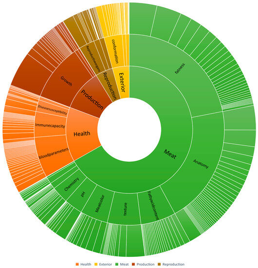 The present study investigated the relationship between CNVRs and QTLs in pigs, with a focus on the top 1% VST-ranked CNVRs (68 CNVRs) (Figure 3). Among these CNVRs, a total of 1842 QTLs were found to overlap, encompassing various traits including meat, health, production, reproduction, and exterior traits. Specifically, 1231 QTLs were associated with meat traits, 256 QTLs with health traits, 194 QTLs with production traits, 82 QTLs with reproduction traits and 79 QTLs with exterior traits.