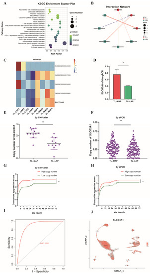 Integrated analysis of the genomic and transcriptomic data. (A) 407 trans-eQTL genes are associated with the “Alzheimer disease” and “Neuroactive ligand-receptor interaction”. (B) Interaction network of 3 CNVRs and 5 neighboring genes with eQTL effects; the yellow line indicates positive regulation, and the purple line indicates negative regulation. Graphs (C,D) represent the relative expression in the SLCO3A1 in the TL-MAP and TL-LAP, and (C,D) are based on transcriptomic data and qPCR mothed, respectively. Images (E,F) are the evaluation results of the copy number of SLCO3A1 via CNVcaller and qPCR (via qPCR: n = 228). Images (G,H) are the relationship between the copy number of SLCO3A1 and CAS. (I) ROC curves of SLCO3A1 copy number as a genetic marker in the MAP and LAP. (J) Single-cell transcriptome data showed extensive expression of SLCO3A1 in the frontal, parietal, temporal and parietal lobes, and in the hypothalamus. * represents p < 0.05, ** represents p < 0.01.
