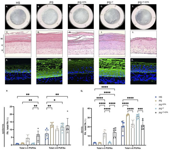 Histology, immunofluorescence and total phospholipid quantification of the skin substitutes. (A–E) Macroscopic representations of healthy and psoriatic skin substitutes. (F–J) Histological representations of H&E staining of healthy and psoriatic skin substitutes. The scale bar represents 100 μm. (K–O) Indirect immunofluorescence staining of K14 expression in healthy and psoriatic skin substitutes. K14 expression is shown in green. The cell nuclei were counterstained with DAPI reagent and are shown in blue. The dashed white lines represent the basement membrane. (P) Characterization of epidermal total fatty acids using gas chromatography. Impact of EPA supplementation on total n-3 and n-6 PUFA percentages (n-3 and n-6 PUFAs/ total fatty acids). (Q) Characterization of dermal total fatty acids using gas chromatography. Impact of EPA supplementation on total n-3 and n-6 PUFA percentages (n-3 and n-6 PUFAs/ total fatty acids). The values are presented as percentages (N = 3 donors, n = 2 skin substitutes per donor). Statistical significance was determined using two-way ANOVA followed by Tukey’s post hoc test. Significant differences are indicated by asterisks (* p < 0.05; ** p < 0.01; *** p < 0.001; **** p < 0.0001). Abbreviations: HS: healthy substitutes; EPA: eicosapentaenoic acid; PS: psoriatic substitutes; PS+EPA: psoriatic substitutes supplemented with EPA; PS+T: psoriatic substitutes produced with T cells; PS+T+EPA: psoriatic substitutes produced with T cells and supplemented with EPA; and T: T cells.