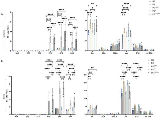PUFA incorporation into epidermal and dermal phospholipids of the skin substitutes. Characterization of the levels of n-3 and n-6 PUFA amounts in the phospholipids of the epidermis and dermis of HS, PS, PS+EPA, PS+T and PS+T+EPA; (A) n-3 and n-6 PUFA levels in the epidermal phospholipid fraction of the skin substitutes; (B) n-3 and n-6 PUFA levels in the dermal phospholipid fraction of the skin substitutes. PUFAs were quantified using gas chromatography, and results are presented as percentages (fatty acids/total fatty acids) (N = 3 donors; n = 2 skin substitutes per donor). Statistical significance was determined using two-way ANOVA followed by Tukey’s post hoc test. Significant differences are indicated by asterisks (* p < 0.05; ** p < 0.01; *** p < 0.001; **** p < 0.0001). Abbreviations: AA: arachidonic acid; ALA: alpha-linolenic acid; DGLA: dihomo-γ-linolenic acid; DHA: docosahexaenoic acid; DPA: docosapentaenoic acid; DTA: docosatetraenoic acid; EPA: eicosapentaenoic acid; ETA: eicosatetraenoic acid; ETE: eicosatrienoic acid; GLA: γ-linolenic acid; HS: healthy substitutes; LA: linoleic acid; T: T cells; n-3: omega-3; n-6: omega-6; PUFAs: polyunsaturated fatty acids; PS: psoriatic substitutes; PS+EPA: psoriatic substitutes supplemented with EPA; PS+T: psoriatic substitutes produced with T cells; and PS+T+EPA: psoriatic substitutes produced with T cells and supplemented with EPA.