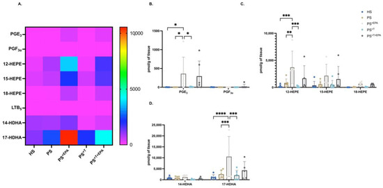 Impact of supplementation with EPA on the n-3 PUFA lipid mediator profile of the skin substitutes. Characterization of the levels of n-3-PUFA lipid mediators in the epidermis of HS, PS, PS+EPA, PS+T and PS+T+EPA. (A) Heatmap of n-3-lipid mediators analyzed using LC-MS/MS in the epidermis of the skin substitutes. (B) Characterization of epidermal n-3 prostaglandins (PG). (C) Characterization of epidermal n-3 hydroxyeicosapentaenoic acids (HEPE). (D) Characterization of epidermal n-3-hydroxydocosahexaenoic acids (HDHA) (N = 3 donors; n = 2 skin substitutes per donor). Statistical significance was determined using two-way ANOVA followed by Bonferroni’s post hoc test. Significant differences are indicated by asterisks (* p < 0.05; ** p < 0.01; *** p < 0.001; **** p < 0.0001). Abbreviations DHA: docosahexaenoic acid; EPA: eicosapentaenoic acid; HEPE: hydroxyeicosapentaenoic acid; HDHA: hydroxydocosahexaenoic acid; HS: healthy substitutes; T: T cells; n-3: omega-3; n-6: omega-6; PG: prostaglandin; PUFAs: polyunsaturated fatty acids; PS: psoriatic substitutes; PS+EPA: psoriatic substitutes supplemented with EPA; PS+T: psoriatic substitutes produced with T cells; and PS+T+EPA: psoriatic substitutes produced with T cells and supplemented with EPA.