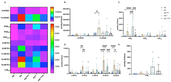 Overall, the n-6 PUFA metabolites were transformed into their respective bioactive lipid derivatives in all skin substitutes. LA and AA lipid mediators were mostly detected in psoriatic skin substitutes as compared with HS (Figure 4A). An increase in the majority of the n-6 lipid mediators was detected in psoriatic substitutes produced with or without T cells (PS and PS+T) compared with HS, in particular for 13-HODE, PGE2, 8-HETE, 12-HETE and 15-HETE (Figure 4B–D). Significant increases in 13-HODE, 8-HETE, 12-HETE and 15-HETE levels were found in PS, while significantly increased levels of PGE2 were found in PS+T (Figure 4B–D). After supplementation with EPA, the amounts of most n-6-lipid derivatives were lowered in PS+EPA and PS+T+EPA. PGE2 was downregulated by the addition of EPA in PS+T+EPA compared with PS+T (Figure 4C). Among the hydroxy fatty acids (HFA), 12-HETE was the most affected mediator following supplementation with EPA, with significant decreases in its levels in both PS+EPA and PS+T+EPA (Figure 4D). 8-HETE and 15-HETE levels were also diminished in PS+EPA compared with PS (Figure 4D). LTB4 was found mainly measured in psoriatic skin substitutes produced with T cells (PS+T and PS+T+EPA) (Figure 4E). The differences in the levels of AA-derived lipid mediators between psoriatic conditions are presented in the supplementary material (see Supplementary Figure S2).