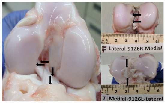 The lateral and medial articulating surfaces of the femoral condyle and tibial plateau of all the studied limbs were stained with India ink and photographed. The length and width of India ink-stained lesions were measured using calipers and the lesion area was approximated as an ellipse []. Based on the macroscopic cartilage changes, ACL samples were categorized into non-PTOA and PTOA groups. If observable macroscopic cartilage damage was present, ACLs were categorized into the PTOA group, and ACLs from pigs with no macroscopic cartilage damage were categorized into the non-PTOA group. ACLs from the PTOA group included all mIAD surgical legs (n = 7).