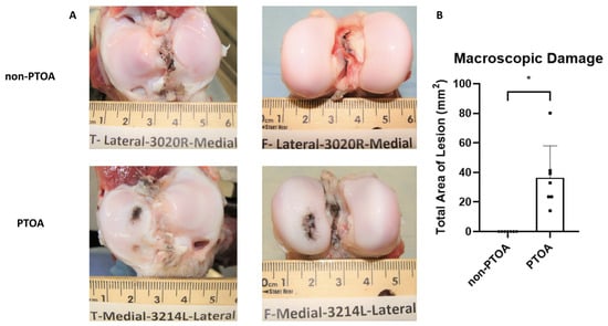 Macroscopic cartilage changes. (A) Images of the median lesions area of the tibial plateau and femoral condyle for non-PTOA and PTOA animals. (B) Total lesion area for non-PTOA and PTOA groups. Error bars represent standard deviation. * Indicates a significant difference between groups (p < 0.05).