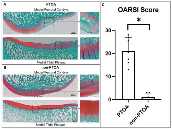 Microscopic cartilage assessment. Histological images of PTOA group’s medial femoral condyle and medial tibial plateau stained with Safranin O-fast green for (A) PTOA and (B) non-PTOA groups. Representative scale bars of 1000 μm and 500 μm, respectively. (C) Severity of cartilage damage indicated by modified OARSI scoring system. Error bars represent the standard deviation. * Indicates a statistically significant difference.