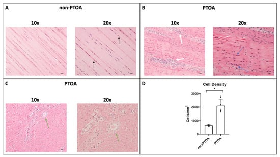 Microscopic changes in ACL. (A) Histological staining (H&E) images of the ACL of non-PTOA minipigs at 10× and 20× magnification. Black arrows indicate healthy spindle-shaped cells with uniaxial alignment. (B,C) Histological images of the ACL of PTOA animals at 10× and 20× magnification. White arrows indicate cell aggregates and lack of alignment. Blue arrows indicate rounded cells. Green arrows indicate hypervascularization with increased cellular infiltrate. (D) ACL cell density. Error bars represent standard deviation. * Indicates significant difference between groups (p < 0.05).
